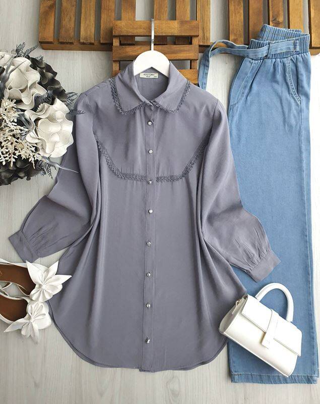 PİNME YAKA VE ÖN İNCE GÜPÜRLÜ GÖMLEK TUNİK C2-5542-26-GRİ