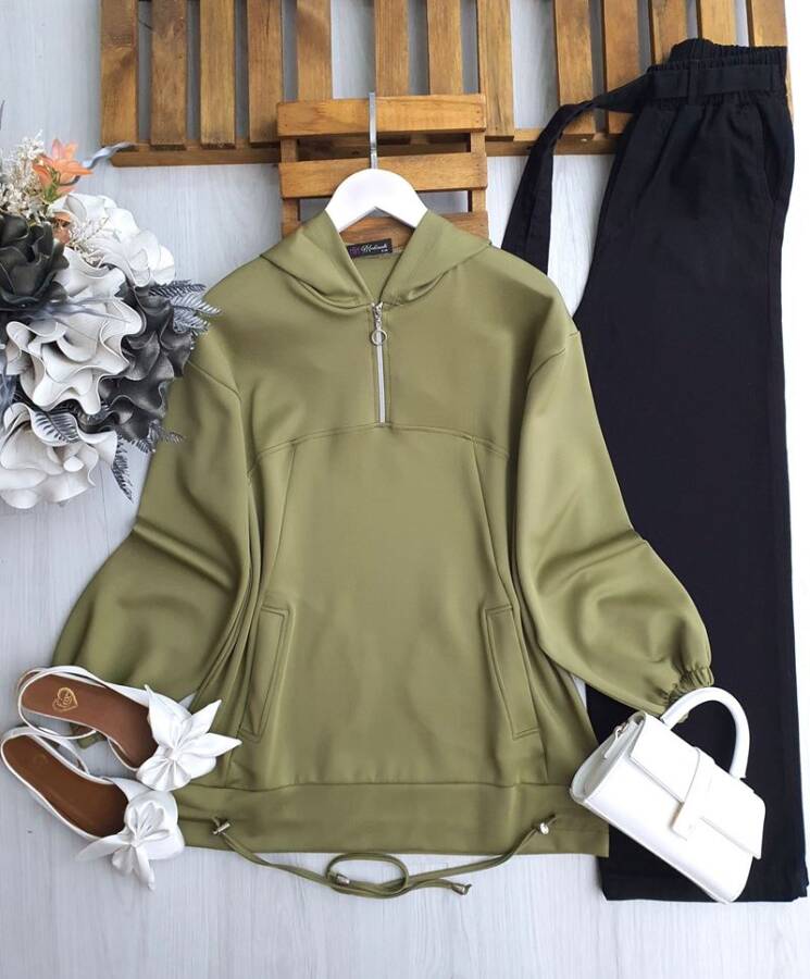 PİVES ALTI İPLİ YARIM FERMUARLI CEPLİ RAHAT KALIP TUNİK 5643-09-HAKİ