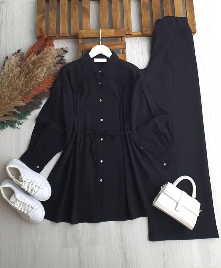 PLESY ÖN VE KOL NEVRULU BELİ İPLİ GÖMLEK TUNİK B2-5 -5655-01-SİYAH
