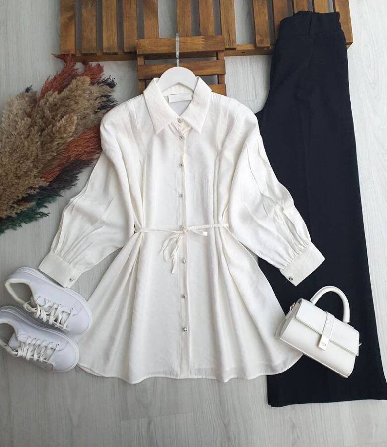 PLESY ÖN VE KOL NEVRULU BELİ İPLİ GÖMLEK TUNİK B2-5-5655-20-BEYAZ