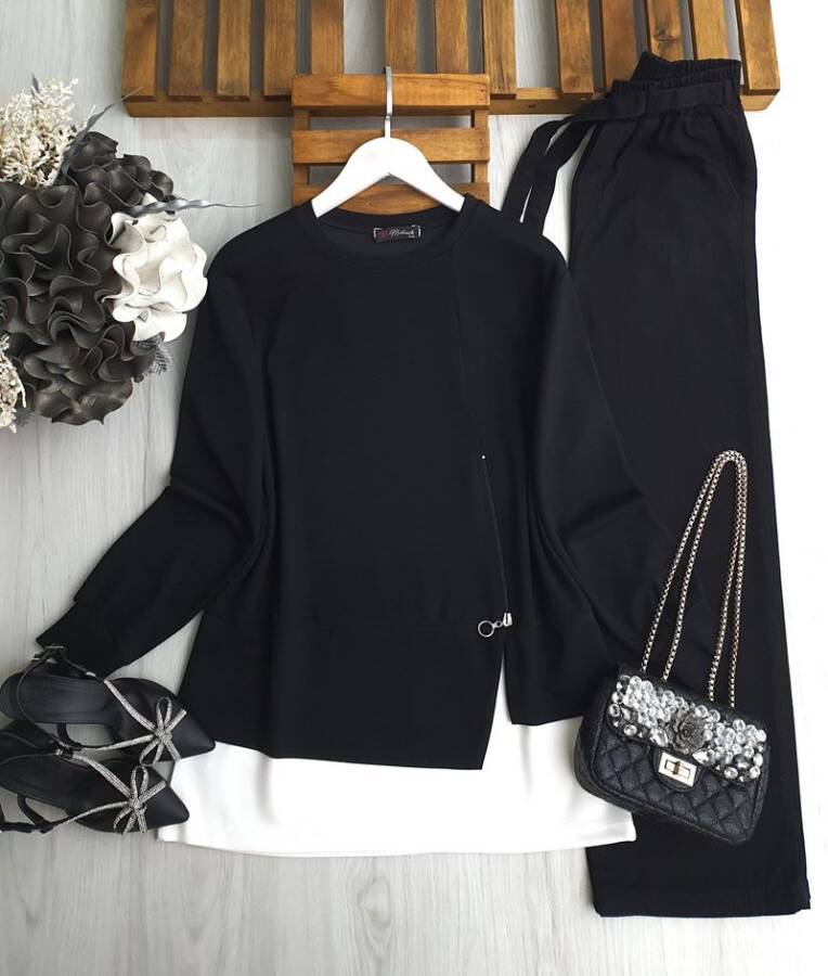 PONİL FERMUAR DETAYLI BEYAZ GARNİLİ TUNİK 5642-01-SİYAH