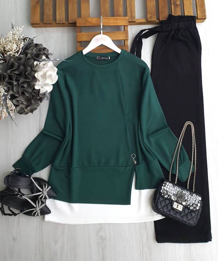 PONİL FERMUAR DETAYLI BEYAZ GARNİLİ TUNİK 5642-27-ZÜMRÜT