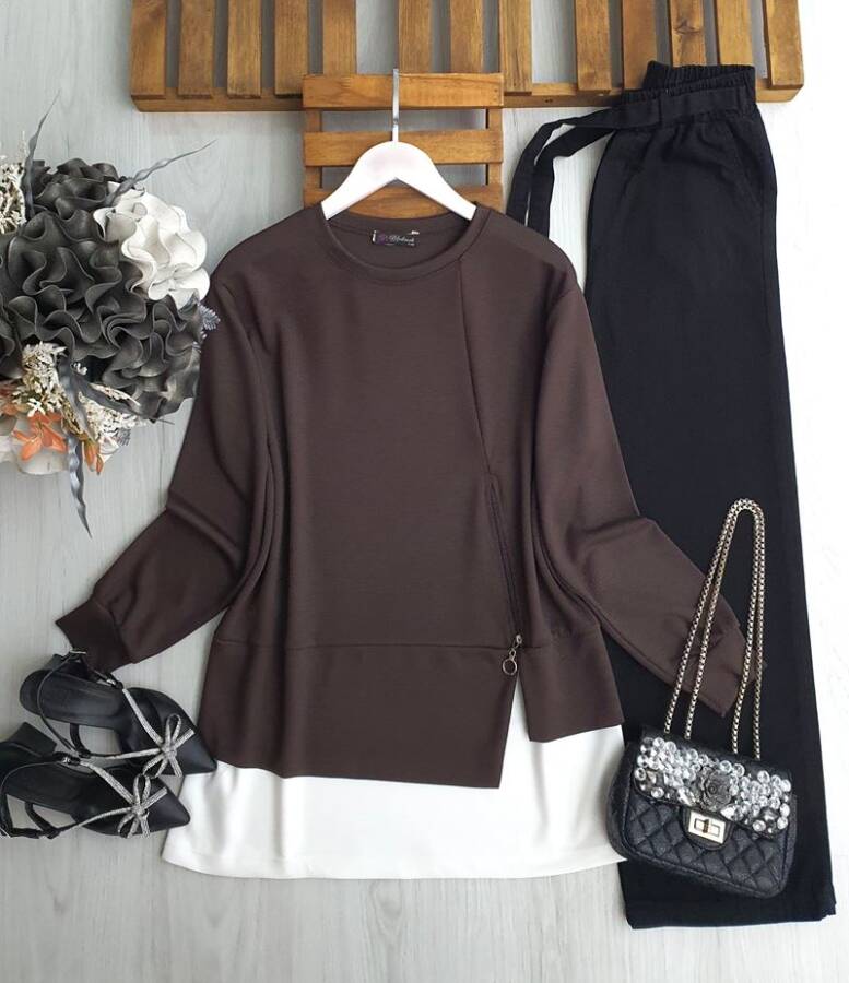 PONİL FERMUAR DETAYLI BEYAZ GARNİLİ TUNİK 5642-37-KAHVE