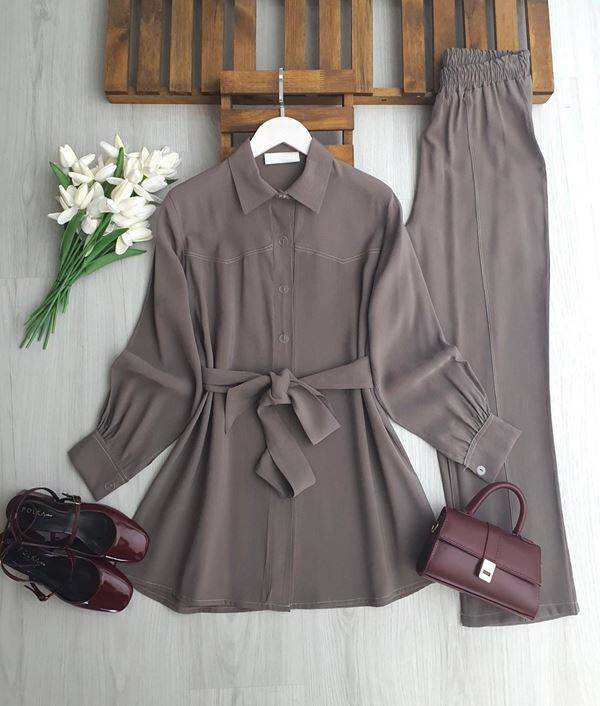 PUMSE DİKİŞ DETAYLI BELİ KEMERLİ TAKIM 1727-25-VİZON