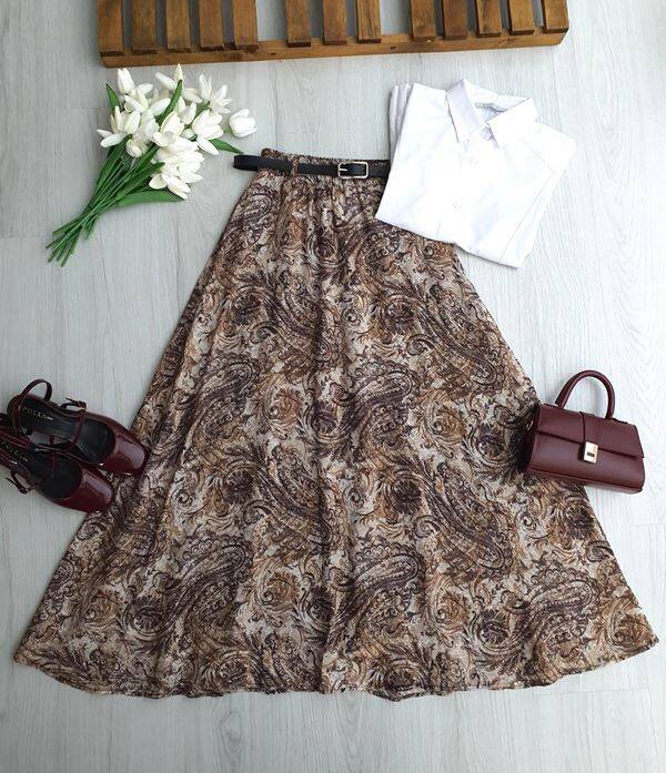 PUNTS DESENLİ İNCE DERİ KEMERLİ ASTARLI ŞİFON ETEK B6-2-6114-37-KAHVE