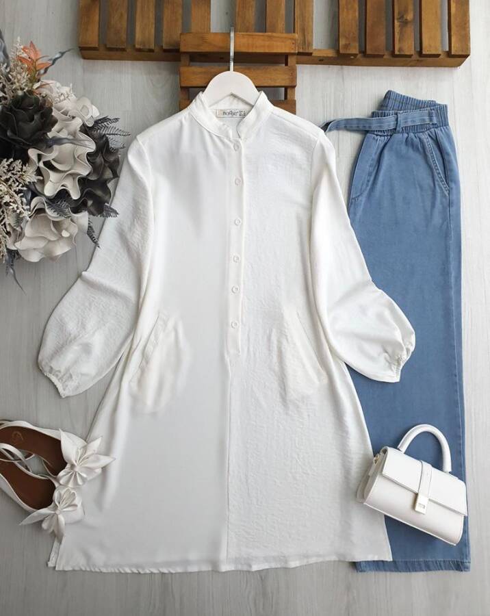 SAYNE HAKİM YAKA CEPLİ BÜYÜK KALIP TUNİK A10-2-23327-20-BEYAZ
