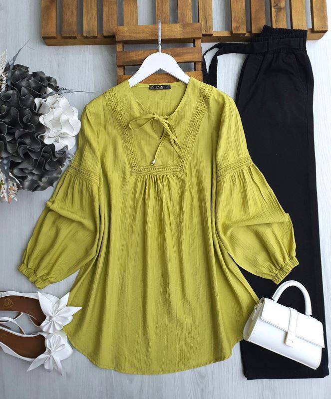SİGYA ÖN VE KOL DANTEL ŞERİTLİ YAKA BAĞCIKLI TUNİK A10-5-5574-70-YAĞ YEŞİLİ