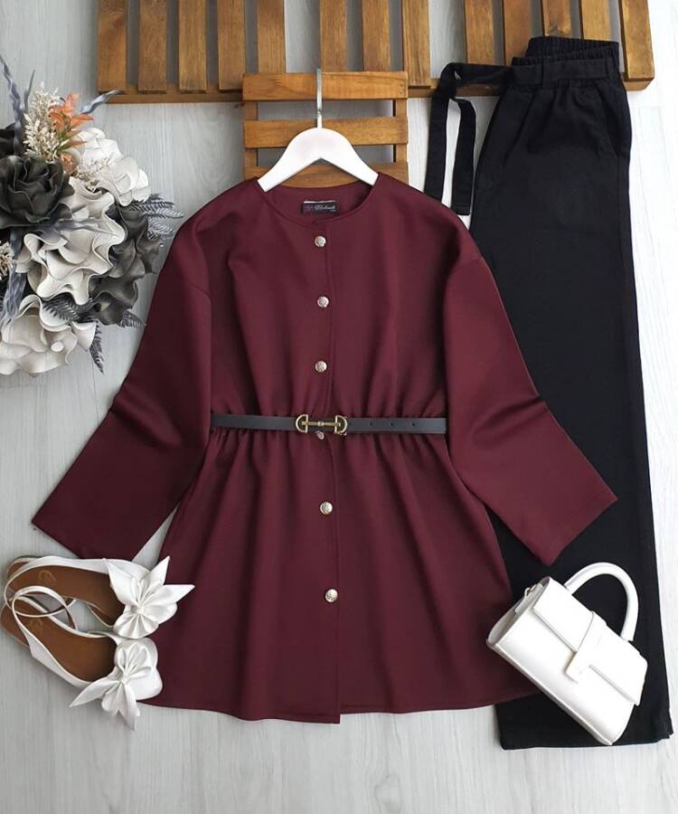SOLD BELİ LASTİKLİ ÖNÜ DÜĞMELİ TOKALI KEMER HEDİYELİ KISA KAP 3205-04-BORDO