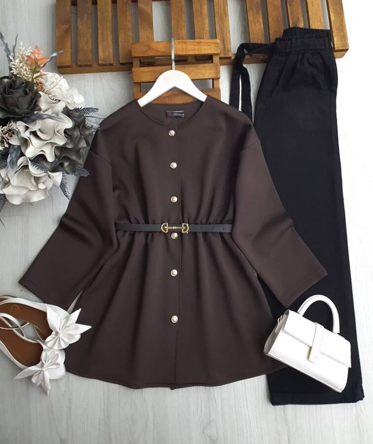 SOLD BELİ LASTİKLİ ÖNÜ DÜĞMELİ TOKALI KEMER HEDİYELİ KISA KAP 3205-37-KAHVE