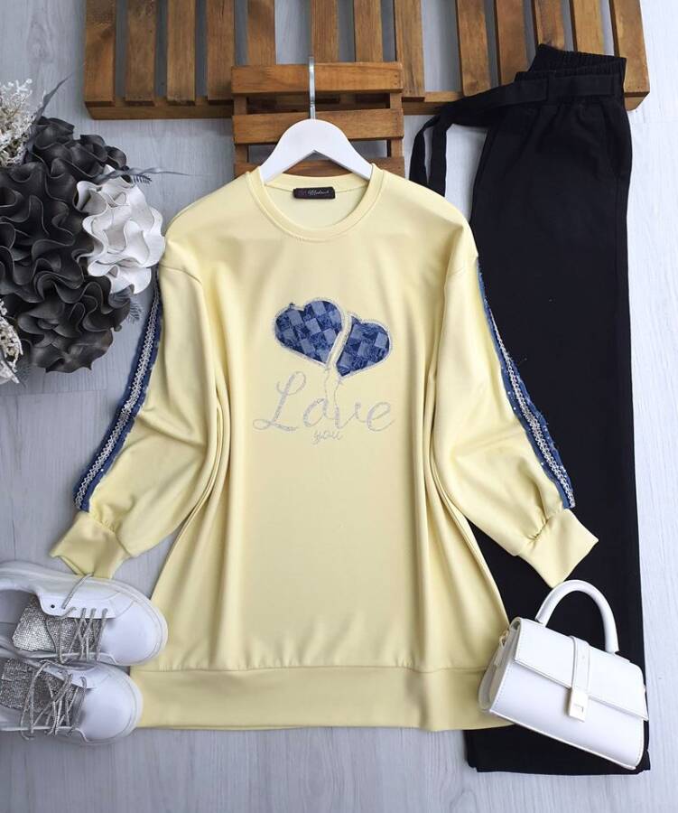 SONEE KOL İŞLEMELİ KOT ŞERİTLİ ÖNÜ İŞLEMELİ KOT YAZILI TUNİK B3-3-5619-23-SARI