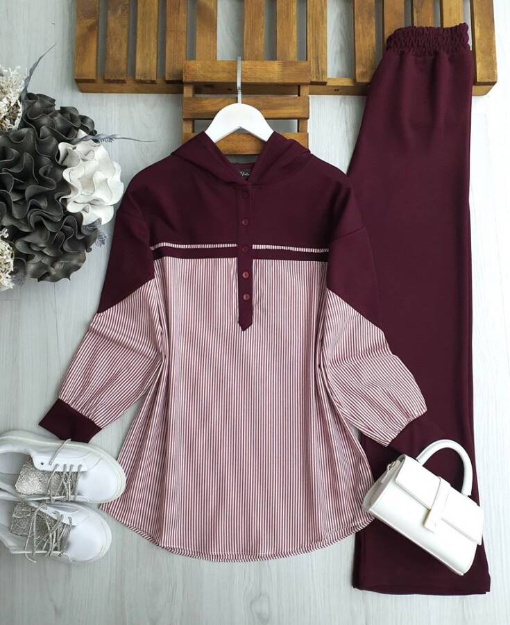 SUNSA YARIM DÜĞMELİ ÇİZGİLİ GÖMLEK GARNİLİ İKİLİ TAKIM 1652-04-BORDO