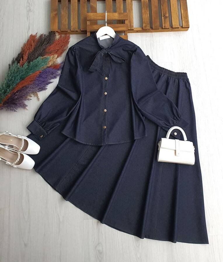 TOCHE YAKA BAĞCIKLI DİKİŞ DETAYLI KOT ETEKLİ TAKIM A6-1-1703-57-KOYU KOT