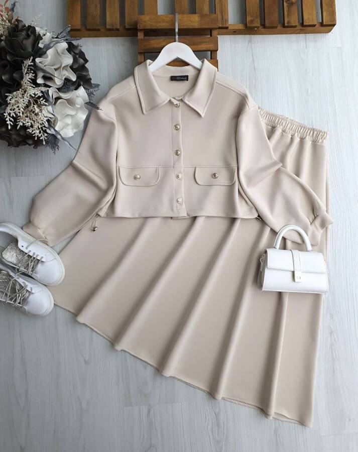 TOYE METAL DÜĞMELİ CEP KAPAKLI ETEKLİ İKİLİ TAKIM B8-2-1672-34-BEJ