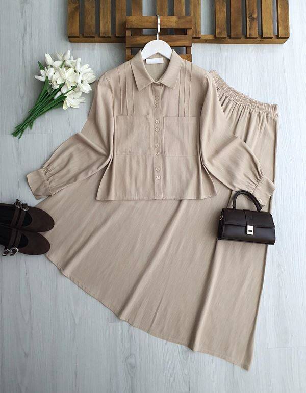 UGPE PİLİ ŞERİTLİ ÇİFT CEP KETEN ETEKLİ TAKIM 1754-34-BEJ