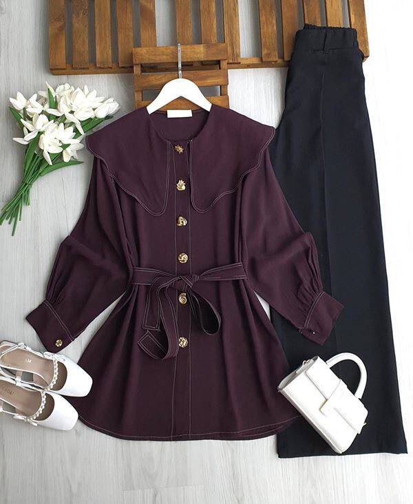 ULBIS BEBE YAKA ÇEŞİTLİ DÜĞMELİ KEMERLİ DİAGONAL CUPRA TUNİK KAP B2-1-5694-18-MÜRDÜM