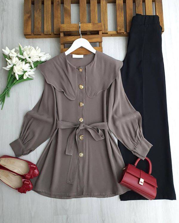 ULBIS BEBE YAKA ÇEŞİTLİ DÜĞMELİ KEMERLİ DİAGONAL CUPRA TUNİK KAP B2-1-5694-25-VİZON