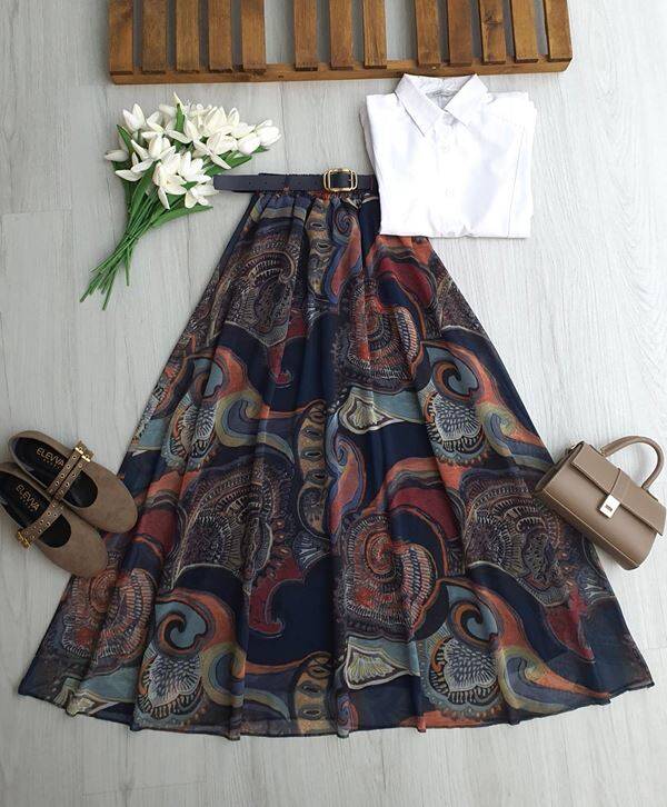 ULGEN SULU DESEN DERİ KEMERLİ BELİ LASTİKLİ ASTARLI ŞİFON ETEK 6113-12-LACİVERT