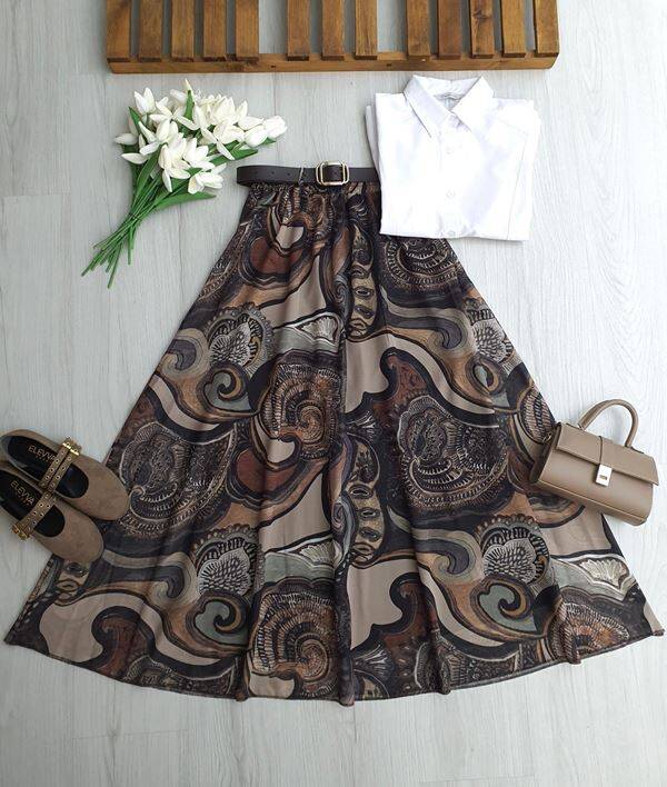 ULGEN SULU DESEN DERİ KEMERLİ BELİ LASTİKLİ ASTARLI ŞİFON ETEK A7-2-6113-37-KAHVE