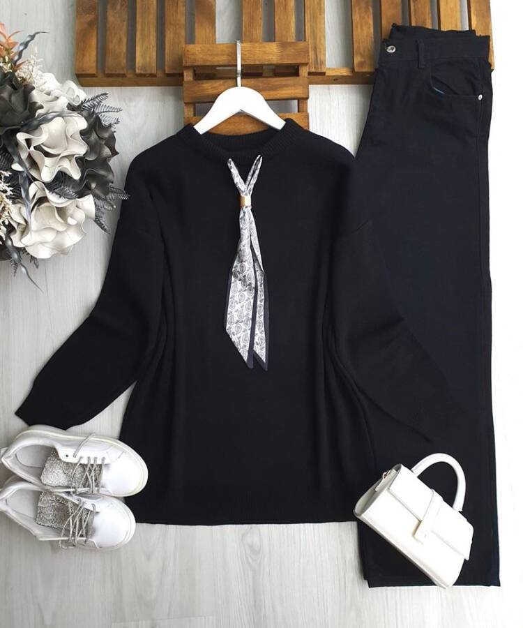 ULSEM ETNİK DESEN FULARLI TRİKO TUNİK 8184-01-SİYAH