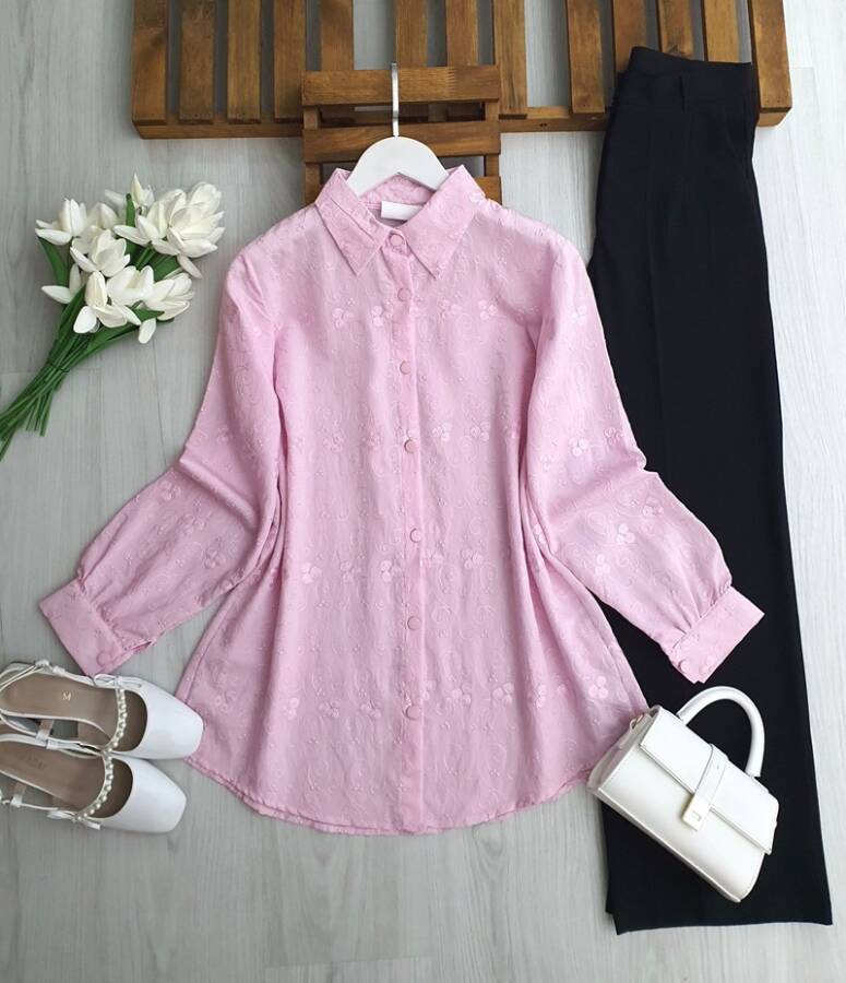 UNGE KENDİNDEN DESENLİ JAKARLI GÖMLEK TUNİK 5682-05-PUDRA