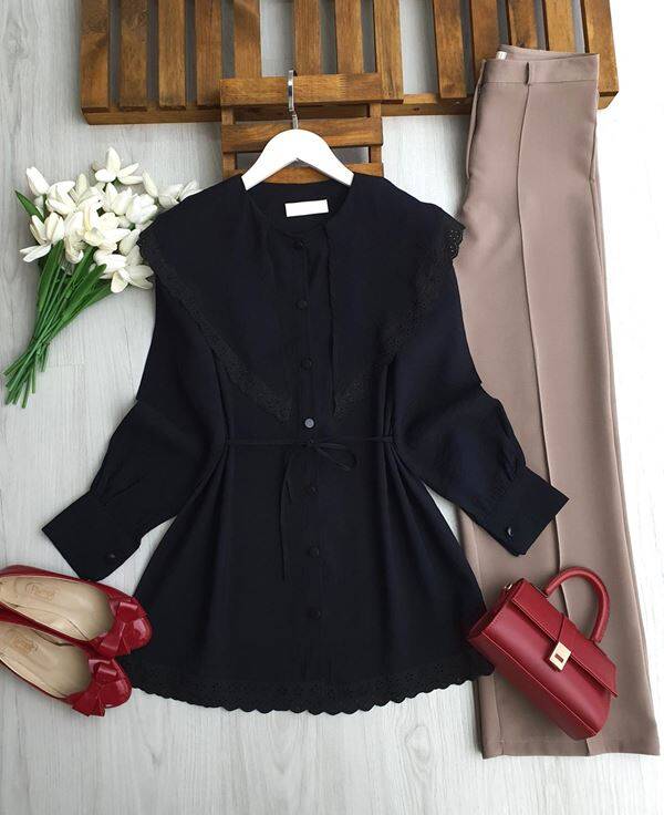 UPYES DANTEL DETAYLI SİVRİ BÜYÜK YAKA GÖMLEK TUNİK B7-1-5703-01-SİYAH