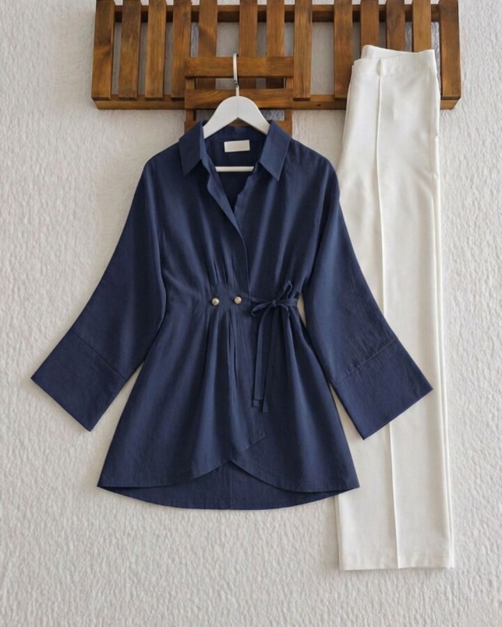 HAUVS TOKALI BÜZGÜ KEMERLİ ŞAL YAKA GÖMLEK TUNİK B9-4-5739-12-LACİVERT