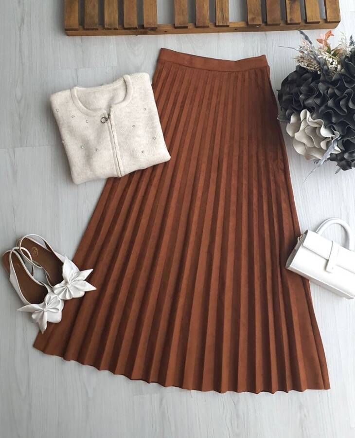 UVEDE PİLİSELİ BELİ LASTİKLİ SÜET ETEK B6-3-6081-17-TABA