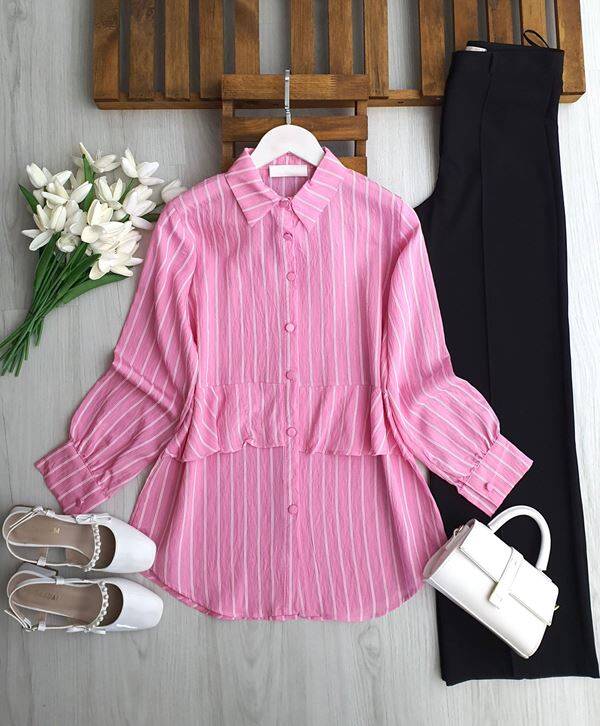 UZLE ALT FIRFIRLI BEYAZ ÇİZGİLİ GÖMLEK TUNİK 5692-05-PUDRA