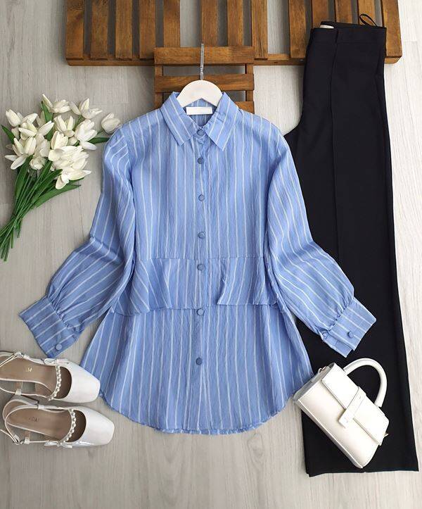 UZLE ALT FIRFIRLI BEYAZ ÇİZGİLİ GÖMLEK TUNİK 5692-10-MAVİ