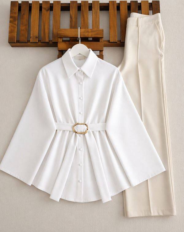 VAKDE SABİT TOKALI KEMERLİ GÖMLEK TUNİK 5723-20-BEYAZ