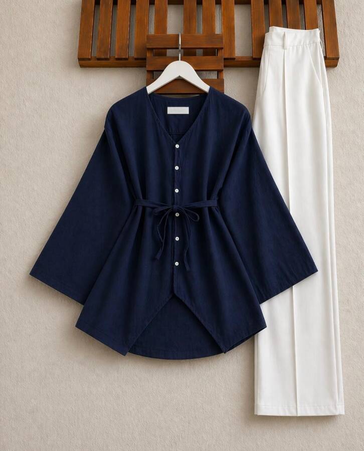 VALH BRİT DÜĞME GENİŞ KOL AÇIK YAKA GÖMLEK TUNİK B4-3-5678-12-LACİVERT