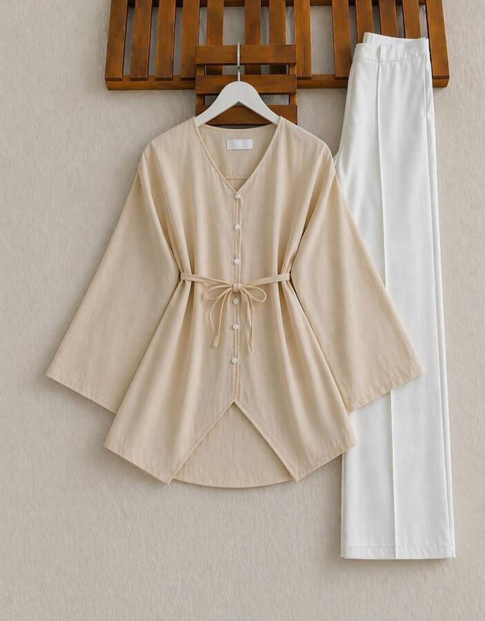 VALH BRİT DÜĞME GENİŞ KOL AÇIK YAKA GÖMLEK TUNİK B4-3-5678-34-BEJ