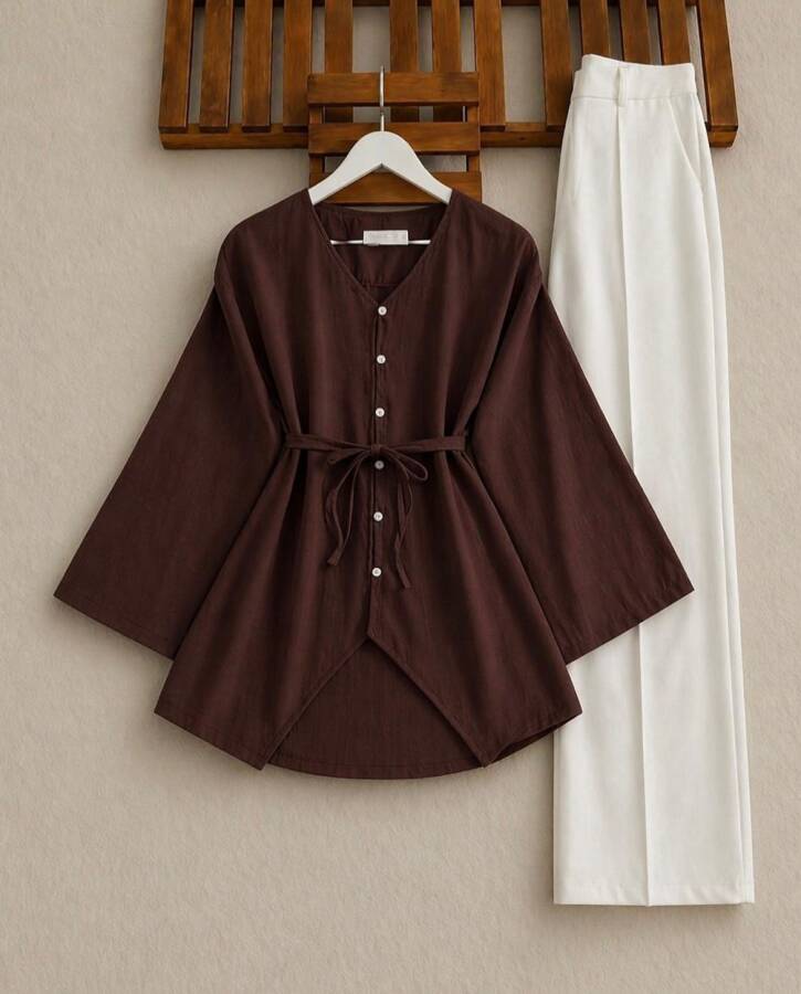 VALH BRİT DÜĞME GENİŞ KOL AÇIK YAKA GÖMLEK TUNİK B4-3-5678-37-KAHVE