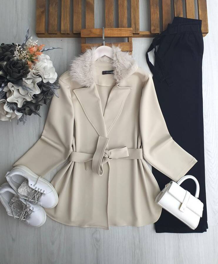 VEMA YAKASI KÜRKLÜ KEMERLİ CAKET KAP A5-1-3213-34-BEJ