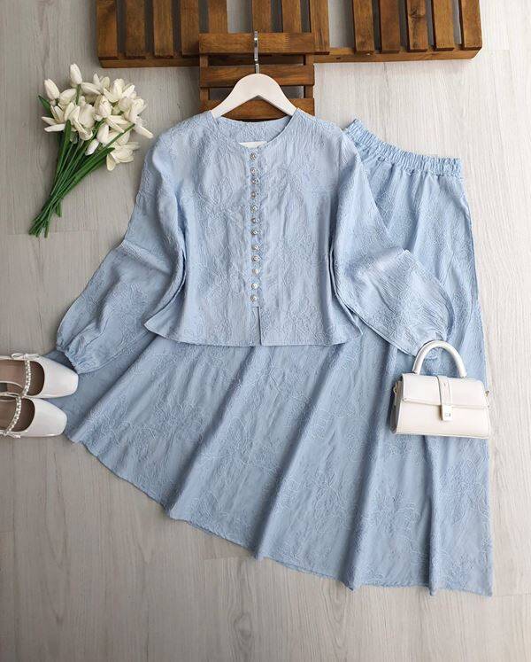 VEQA BRİT DÜĞMELİ KABARTMA DESEN ETEKLİ TAKIM B3-1-1758-10-MAVİ
