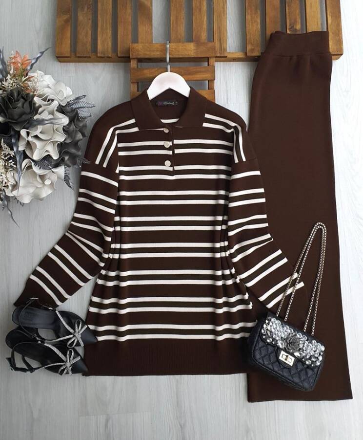 VOMGE İNCE ÇİZGİLİ YAKALI TRİKO TAKIM B1-5-8174-37-KAHVE