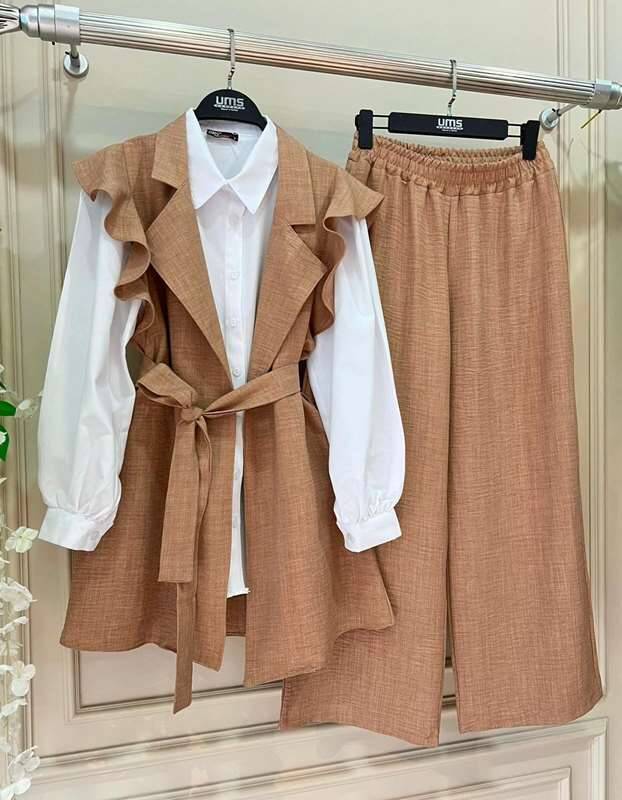 VOUP ÖNÜ AÇIK KEMERLİ KETEN ÜÇLÜ TAKIM B7-2-1533-48-BİSKÜVİ