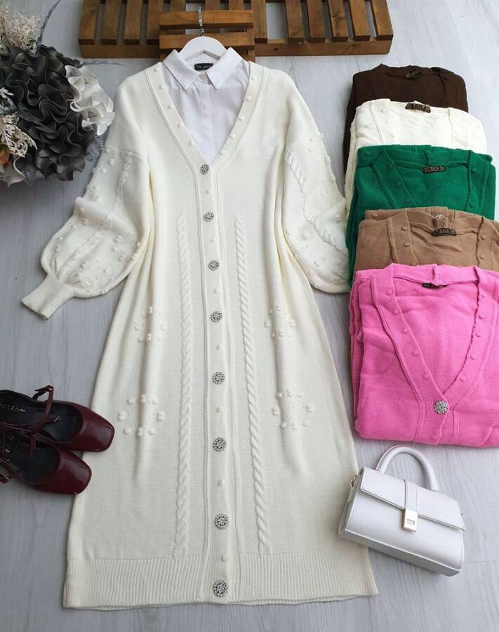 VOY ÖNÜ DÜĞMELİ BALON KOL TRİKO HIRKA 8143-50-KEMİK