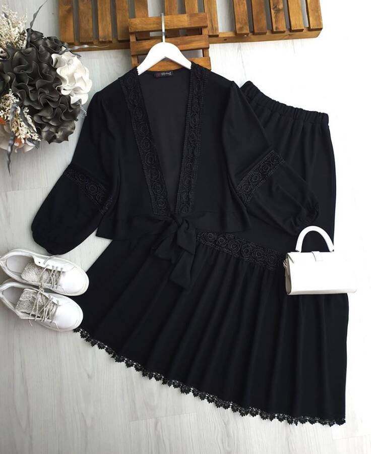 VUE ÖNÜ BAĞLAMALI DANTEL GEÇİŞLİ ETEKLİ İKİLİ TAKIM 1670-01-SİYAH