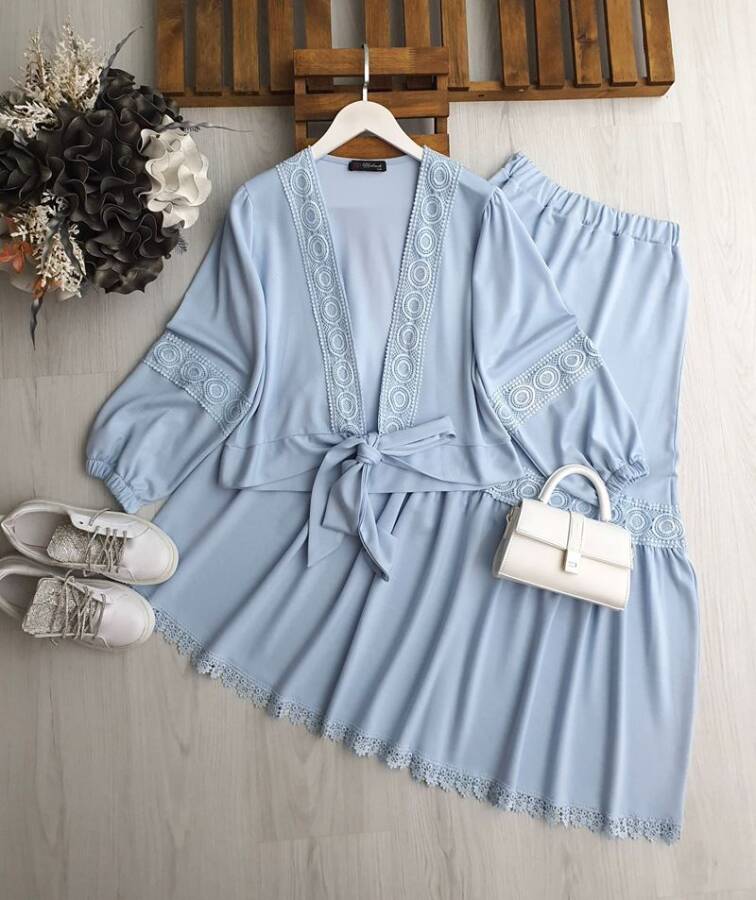 VUE ÖNÜ BAĞLAMALI DANTEL GEÇİŞLİ ETEKLİ İKİLİ TAKIM 1670-10-MAVİ