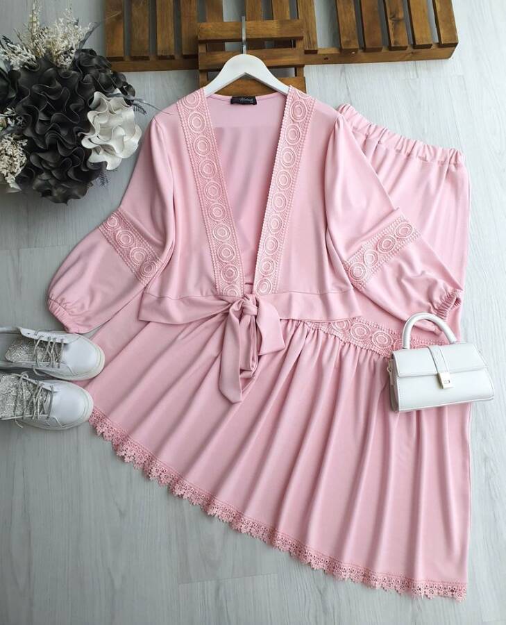 VUE ÖNÜ BAĞLAMALI DANTEL GEÇİŞLİ ETEKLİ İKİLİ TAKIM 1670-47-PEMBE