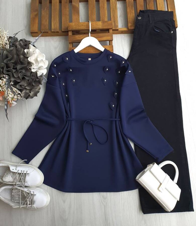 YAZL BEL İPLİ KALP AKSESUAR ÜSTÜ TAŞLI TUNİK 5652-12-LACİVERT