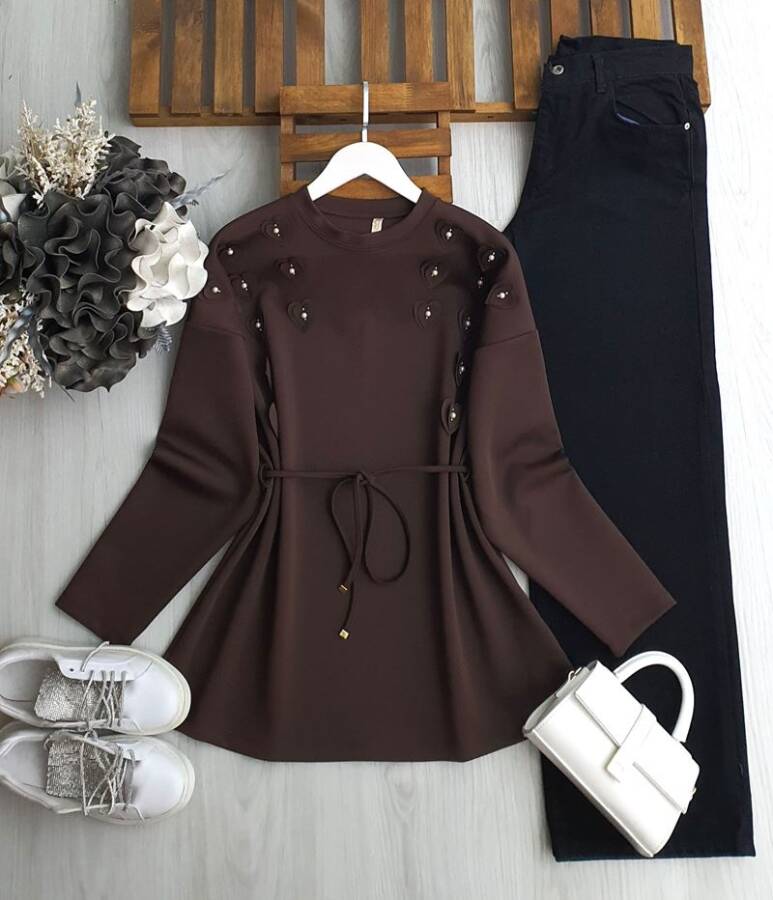 YAZL BEL İPLİ KALP AKSESUAR ÜSTÜ TAŞLI TUNİK 5652-37-KAHVE