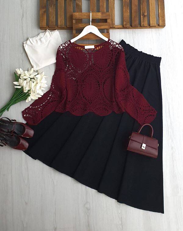 YCL DANTEL ÖRGÜ BLUZ 8204-04-BORDO