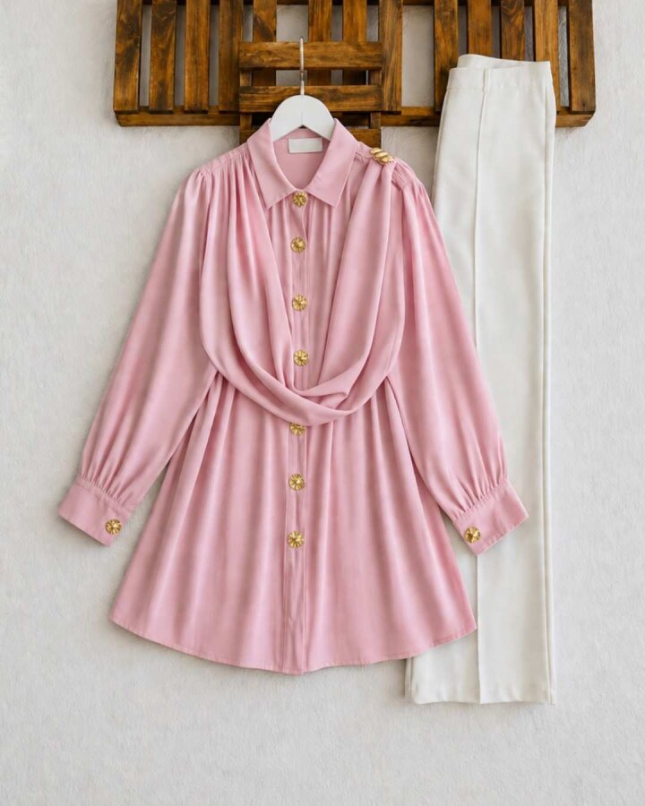 YEGFA TOKALI KENDİNDEN ŞALLI GÖMLEK TUNİK A3-5-5689-05-PUDRA