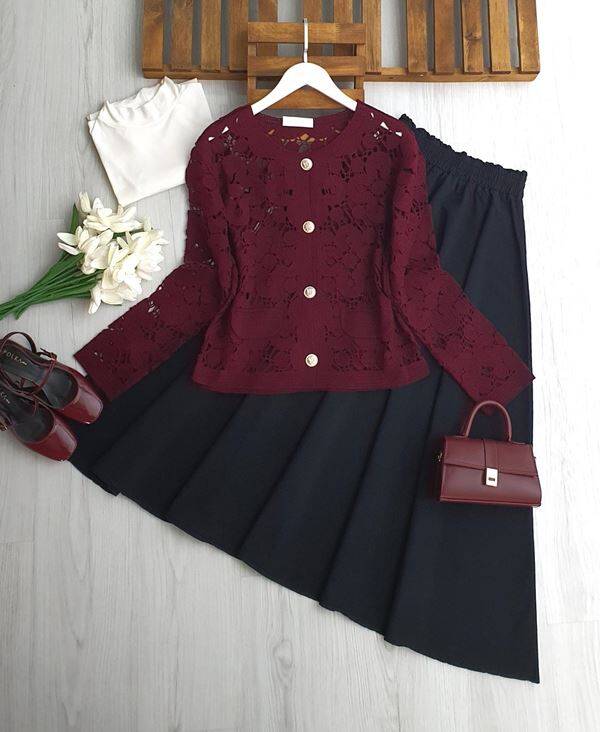 YOBFE DÜĞMELİ DANTEL ÖRGÜ HIRKA 8200-04-BORDO