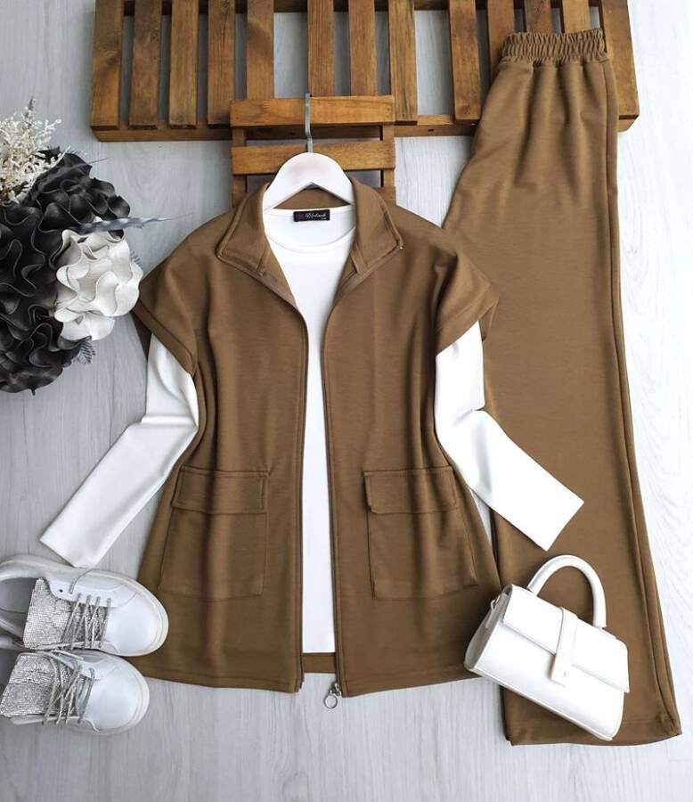 YOCN FERMUARLI ÇİFT CEP YELEKLİ ÜÇLÜ TAKIM 1655-19-HARDAL