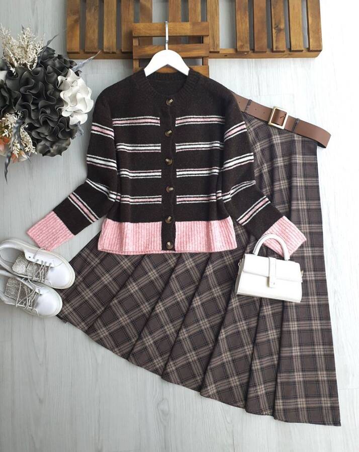 YODLA ÇİZGİLİ GARNİLİ YUMOŞ HIRKA A8-3-3222-102-PUDRA-KAHVE