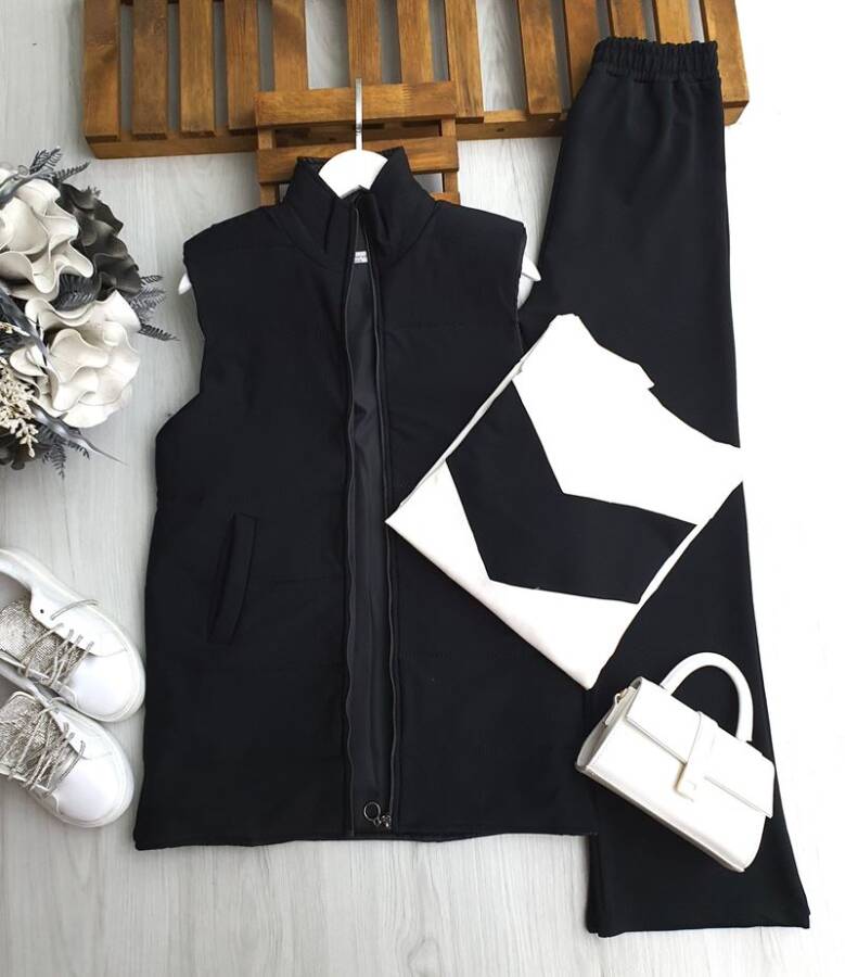 YUNNA İÇİ ELYAF ASTARLI YELEK GARNİLİ TUNİK PANTOLON ÜÇLÜ TAKIM B6-1-1663-01-SİYAH