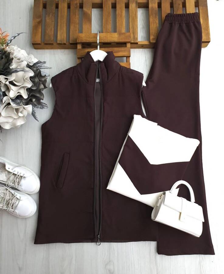 YUNNA İÇİ ELYAF ASTARLI YELEK GARNİLİ TUNİK PANTOLON ÜÇLÜ TAKIM B6-1-1663-37-KAHVE